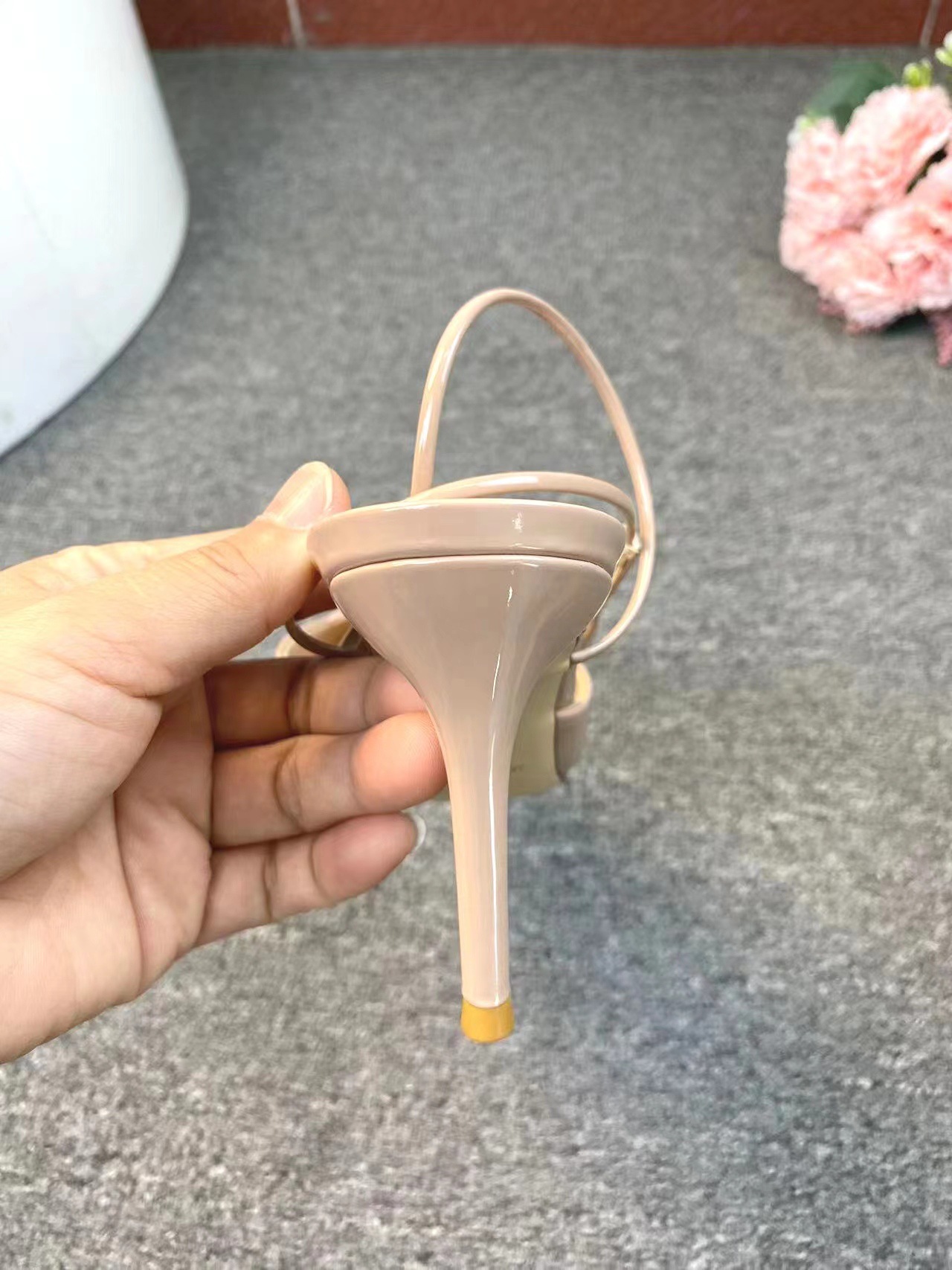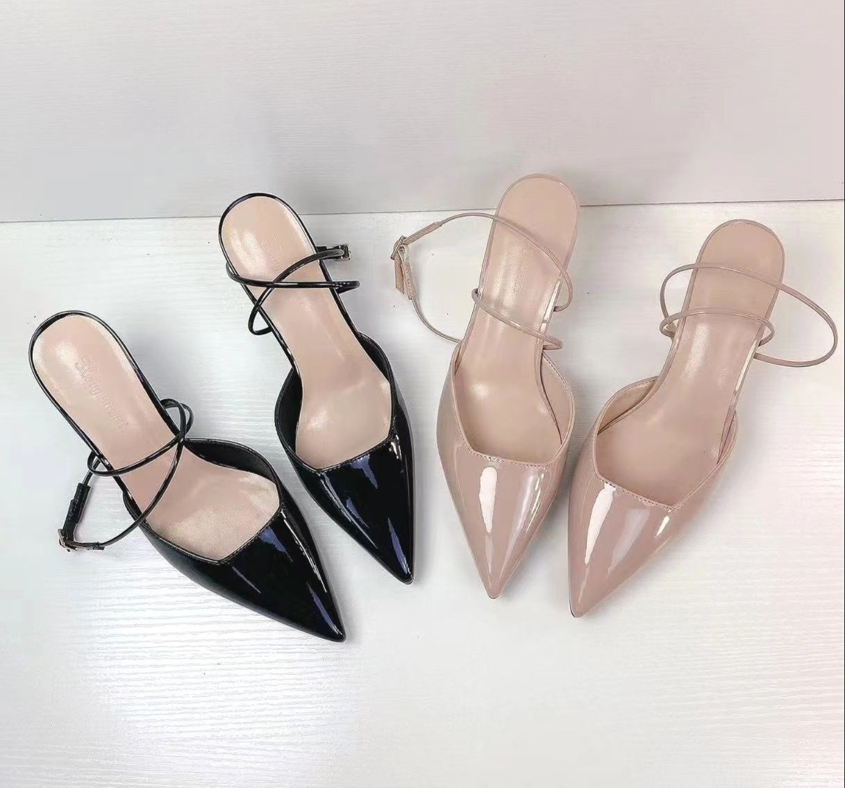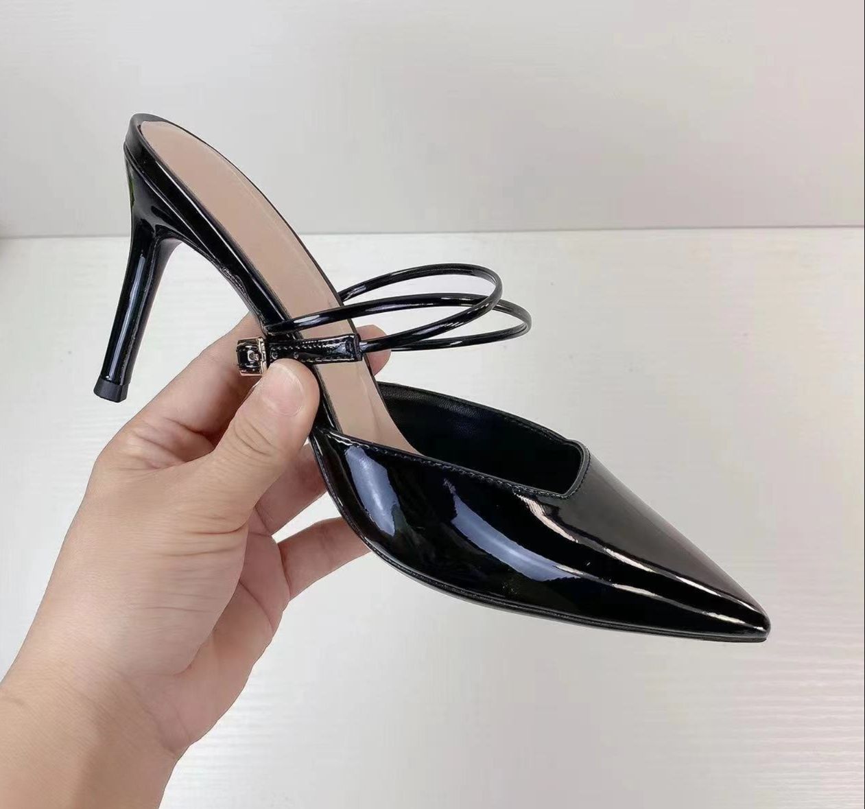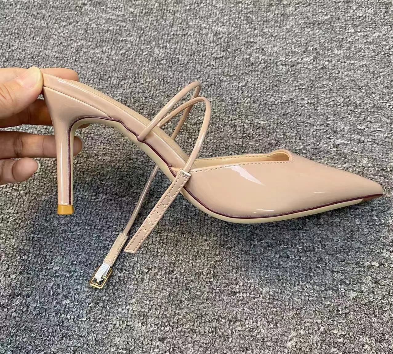 華奢なアンクルストラップが足首を美しく見せ、ポインテッドトゥのデザインが洗練された印象を与えます。